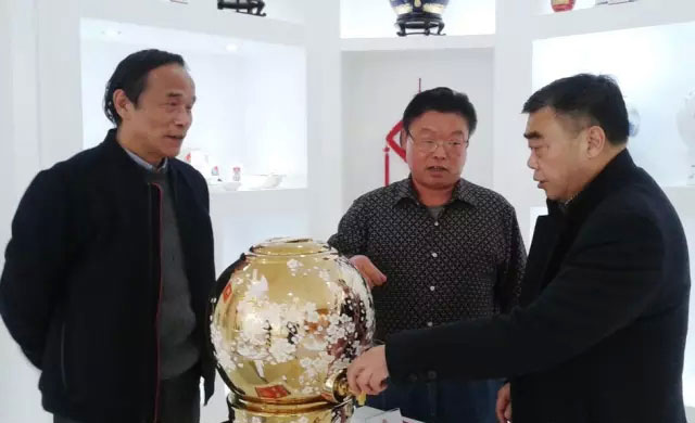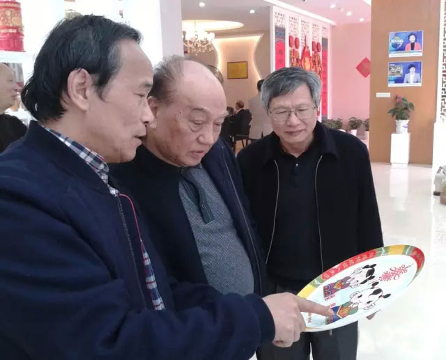 王壽霖(中)在觀看春節(jié)吉祥物陶瓷產(chǎn)品。