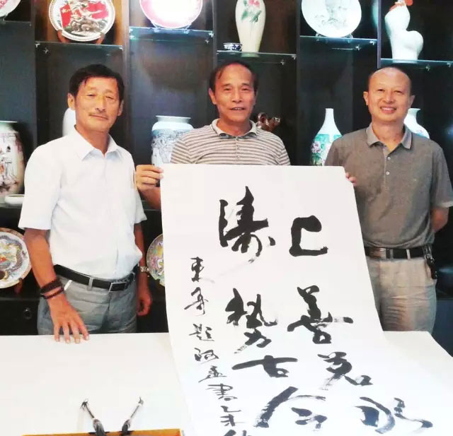市書法家協(xié)會(huì)主席郭立(中)、著名設(shè)計(jì)師、陶藝家、書法家孟木根(右一)等應(yīng)邀到主題館指導(dǎo) 。